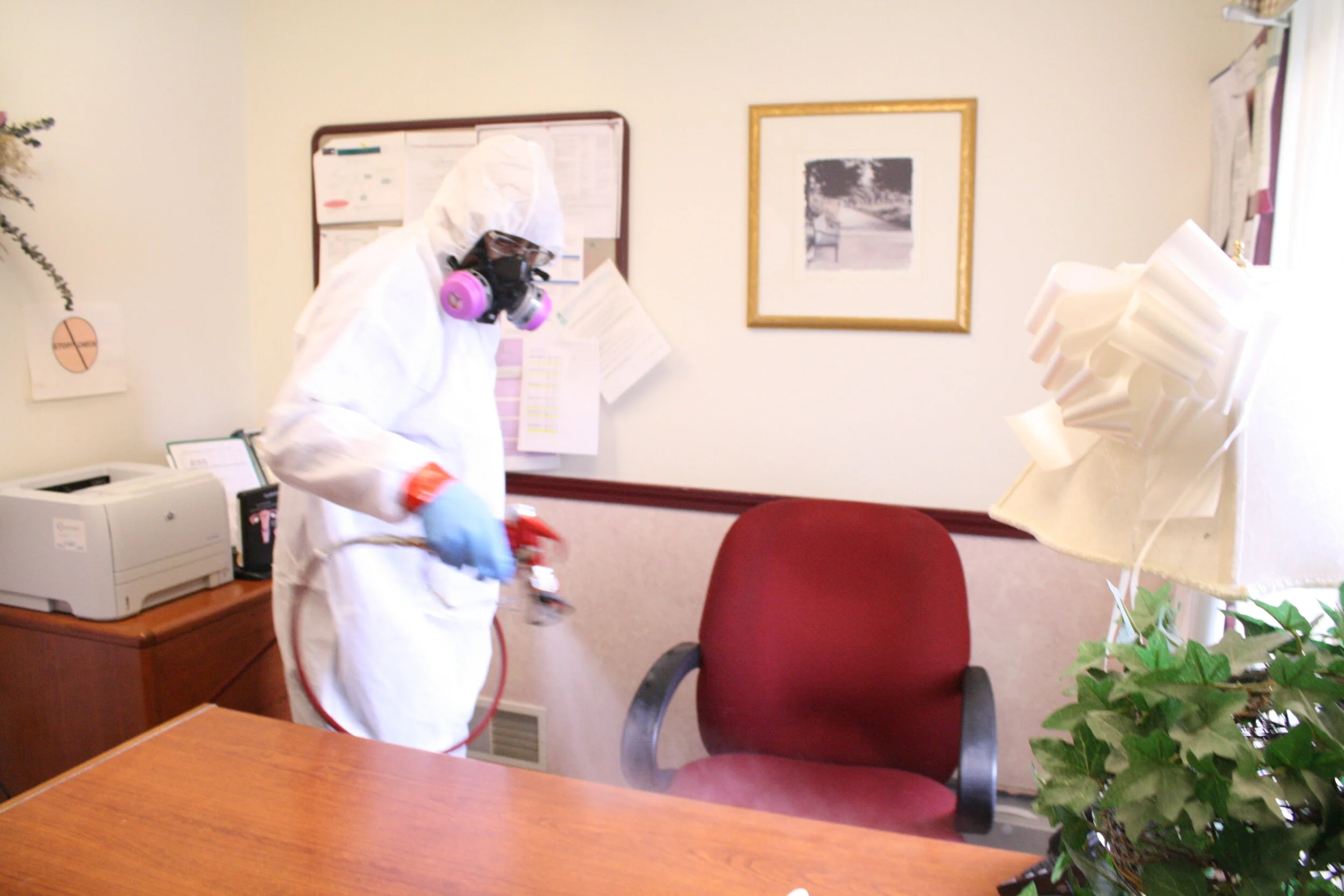 Our team uses electrostatic sprayers, which work by charging liquids (disinfectants, sanitizers) as they pass through a sprayer nozzle. This creates charged droplets that repel one another and actively seek out surfaces, which they stick to and wrap around, coating all sides.